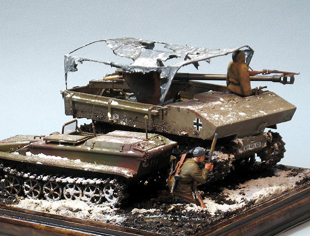 Выставляю на ваш суд маленькую виньетку. Я назвал ее «Зверобой». Ведь звери бывают разные, соответственно и зверобой тоже. Действие происходит где-то на Восточном фронте в конце войны. Весь пластик - Драгон, за исключением базы RSO. Зверобой Звезда. Красил акрилом и супером Звезда, акрилом Валехо. Тонировка масло. Снег сода + ПВА.